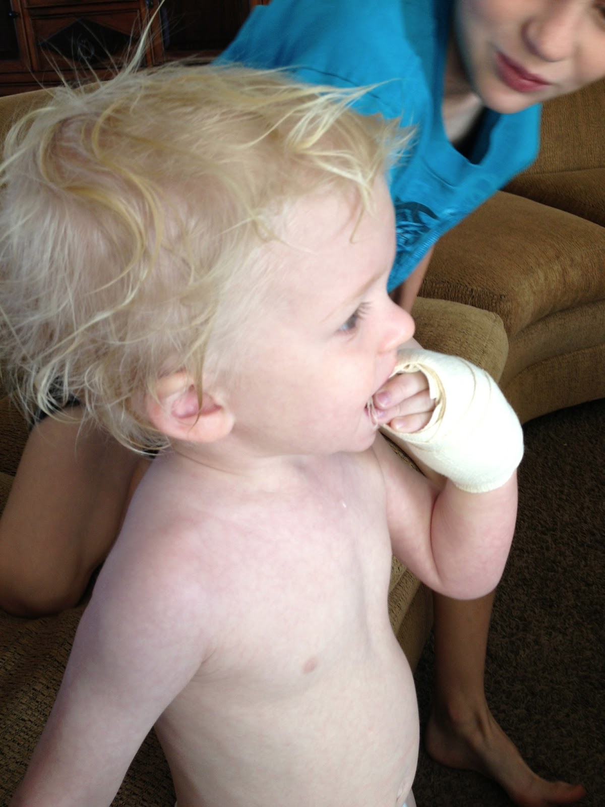 He had to wear this little wrap, but after the first day, he figured out how to take it off, so once we put it on, we then had to secure it with duck tape, it looked so trashy! But, you do what you gotta do, right?